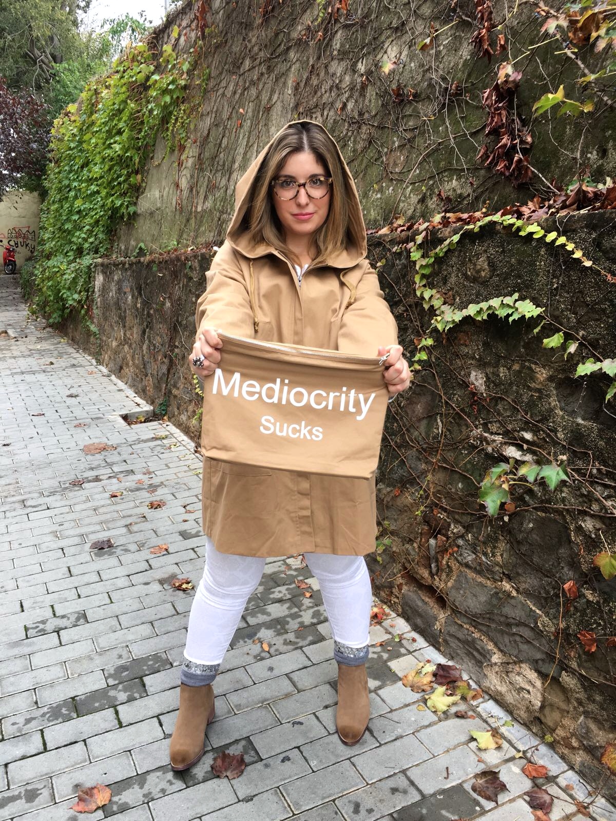 Con estos días grises que estamos teniendo os proponemos un look con mensaje muy original. La parka y el clutch de color camel llevan el logo "Mediocrity Sucks", porque a nosotras no nos gusta lo convencional. El conjunto es de Compañía Fantástica para SERENDIPITY, al igual que los botines.