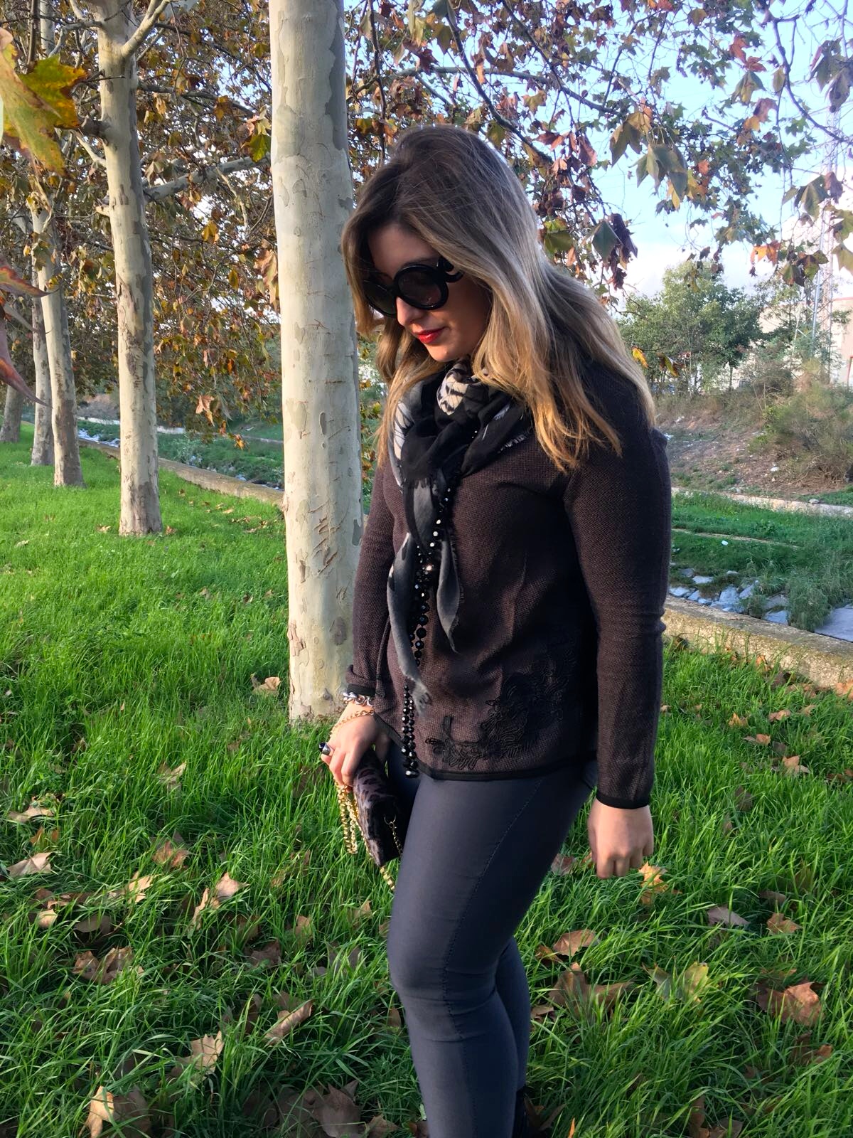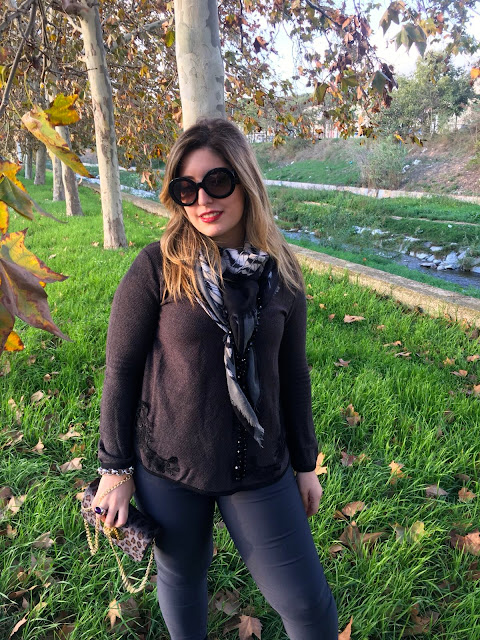 El fulard es reversible y lo habéis visto en varios posts del blog porque me encanta y pega con muchísima ropa de la que tengo, ya que lo puedes llevar con el fondo gris o con el fondo negro. Es de Molly Bracken al igual que el bolsito en animal print peludito con cierre corazón.