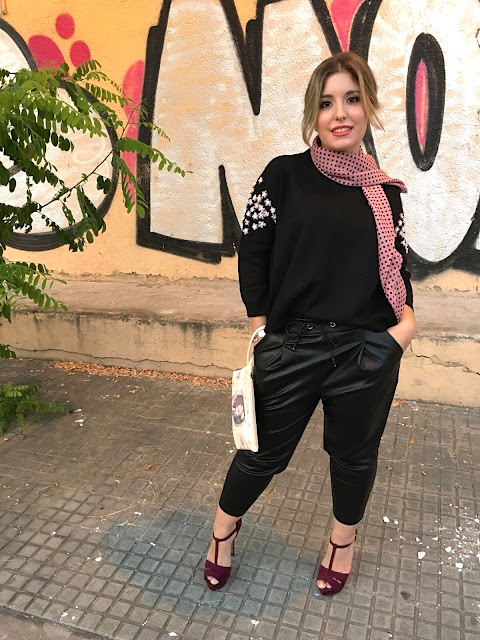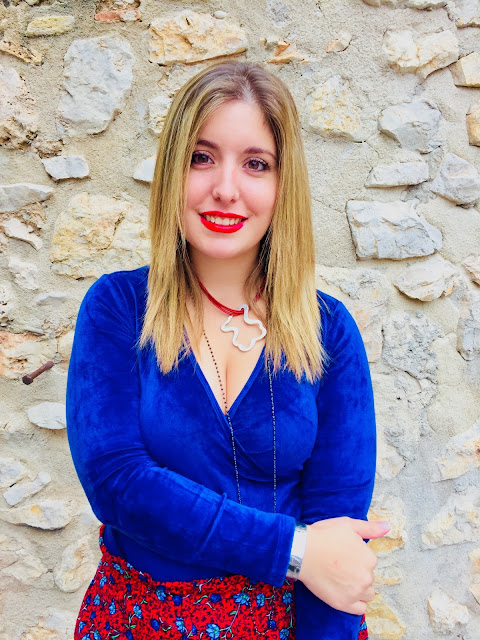Este look se compone por body y bailarinas de terciopelo o velvet, en color azul cyan de la marca Compañía Fantástica. El terciopelo es uno de los tejidos estrella esta temporada y todas nuestras firmas lo muestran en sus colecciones. El pantalón de estampado floral tipo sarouel (evolución actual del tradicional saragüell) es también de Compañía Fantástica. Es de color granate, un color imprescindible todas las campañas de otoño con flores estampadas en color azul cyan que nos combina a la perfección con el body y las bailarinas.