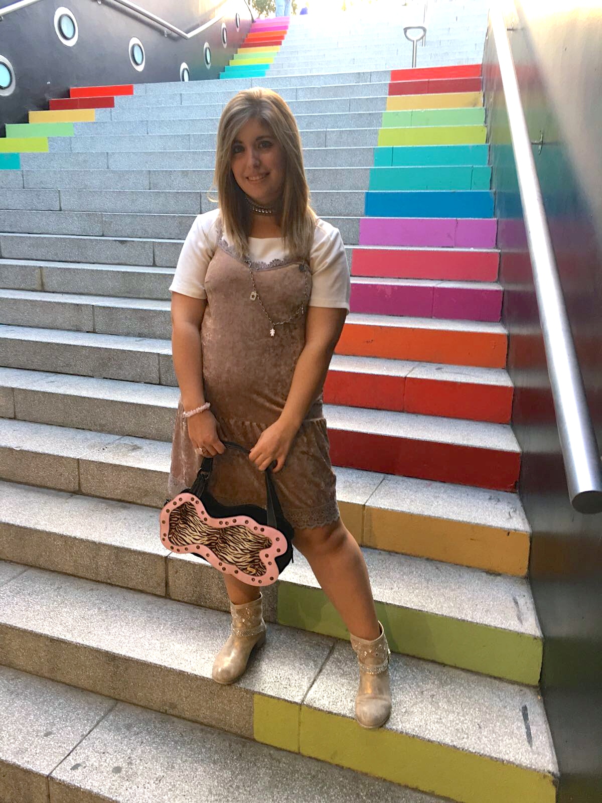El choker le da un punto chic y los complementos en toques rosa hacen que las gamas de colores sean las mismas para conseguir un resultado homogéneo y agradable a la vista.