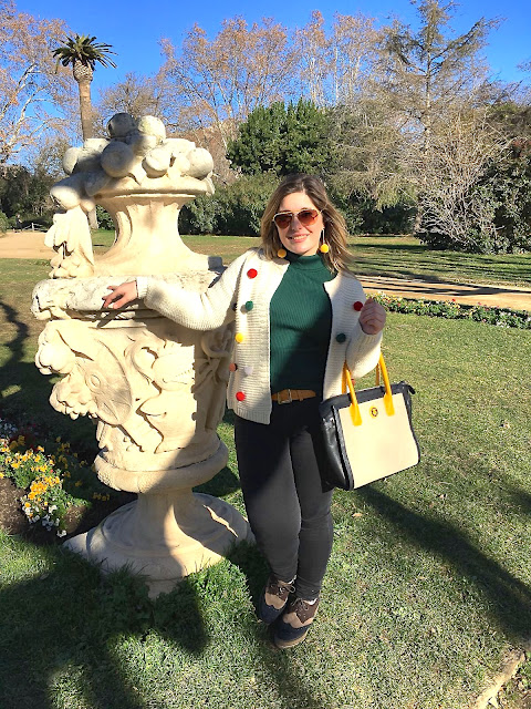 En el post de hoy, el primero del año os enseño un look divertido y genial para vuestro día a día. El protagonista absoluto es el cardigan de pompones multicolor. Como lleva pompones amarillos y verdes entre otros, decidí combinarlo con estos dos colores. En amarillo con los pendientes de pompones, el cinturón y el bolso mientras que el verde lo usé en el jersey, de cuello cisne, en punto canapé y liso para darle importancia al cardigan.